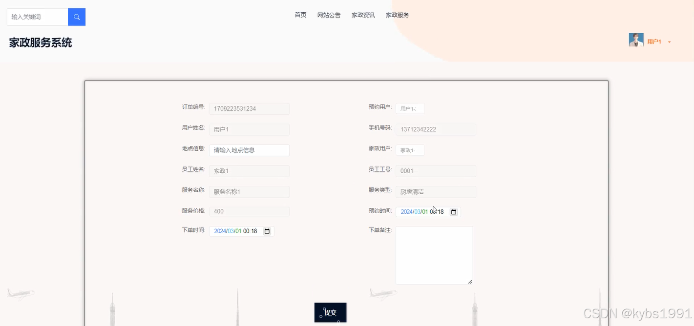 (5)预约:当用户在家政服务详情界面想要进行预约,点击下方的“预约”按钮,就会跳转到预约信息填写界面,根据界面提示输入预约信息,点击“提交”按钮,预约就完成了;