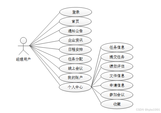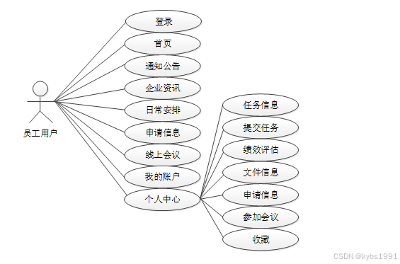 员工用户账号由管理员在后台直接添加。进入系统后主要实现通知公告、企业资讯、日常安排、申请信息、线上会议、我的账户(修改资料+修改密码)、个人中心(任务信息+提交任务+绩效评估+文件信息+申请信息+参加会议+收藏)等功能进行查看或者管理。图2-1就是员工用户角色的用例展示。