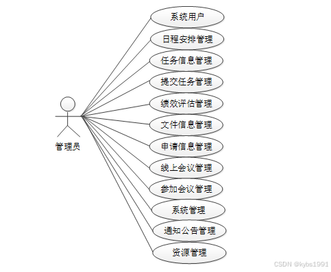 管理员进入系统后主要实现对员工用户和部门经理的注册账号添加,和对日程安排管理、任务信息管理、提交任务管理、绩效评估管理、文件信息管理、申请信息管理、线上会议管理、参加会议管理、系统管理、通知公告管理、资源管理等主要模块的信息处理工作。