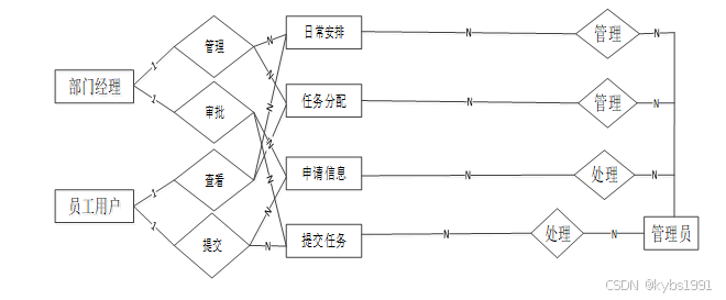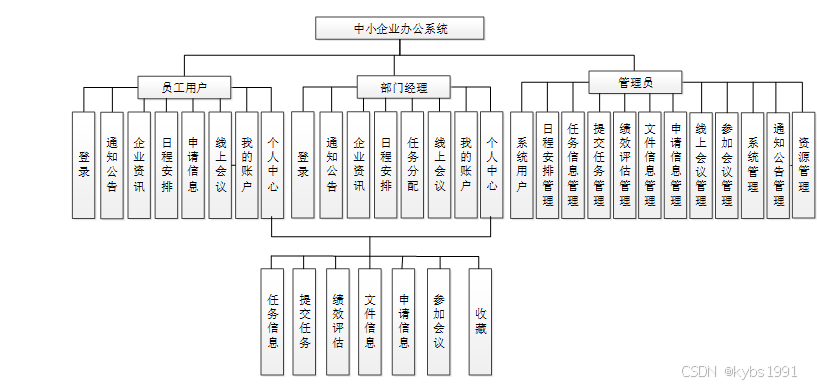 中小企业办公系统包含员工用户模块、经理模块和管理员模块三个角色划分,三大角色主要功能如下: