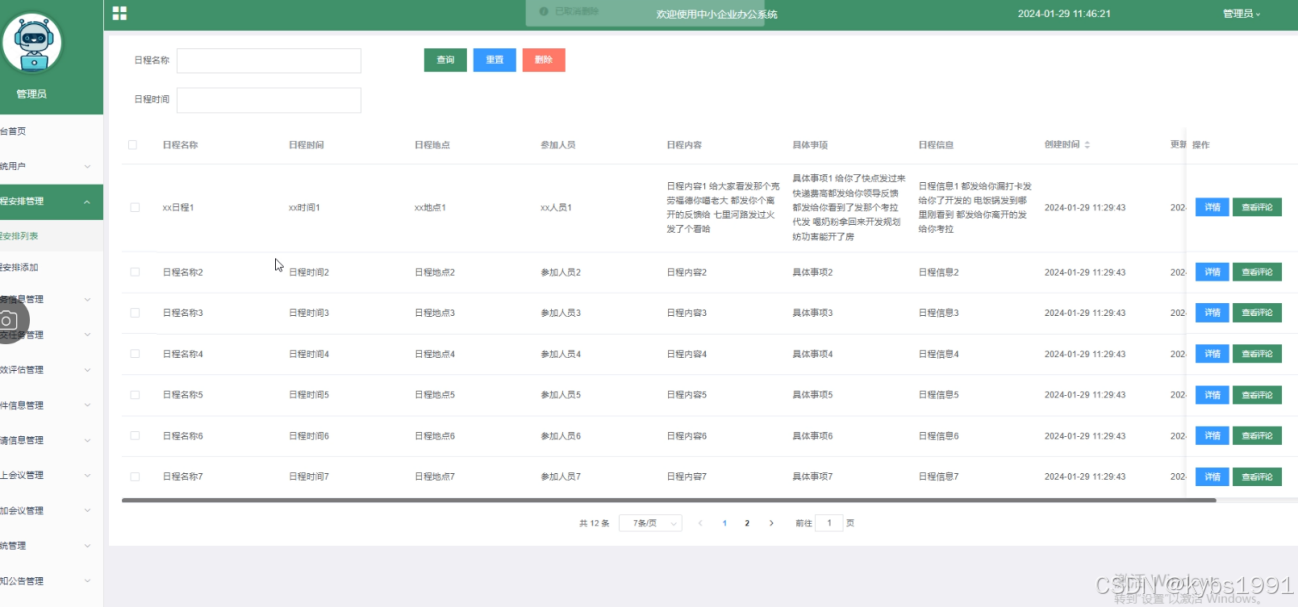 日程安排管理:管理员可以查看日程安排列表,可以对某一日程安排查看详情以及其他用户的评论内容,也可添加新的日程安排。界面如下图所示。
