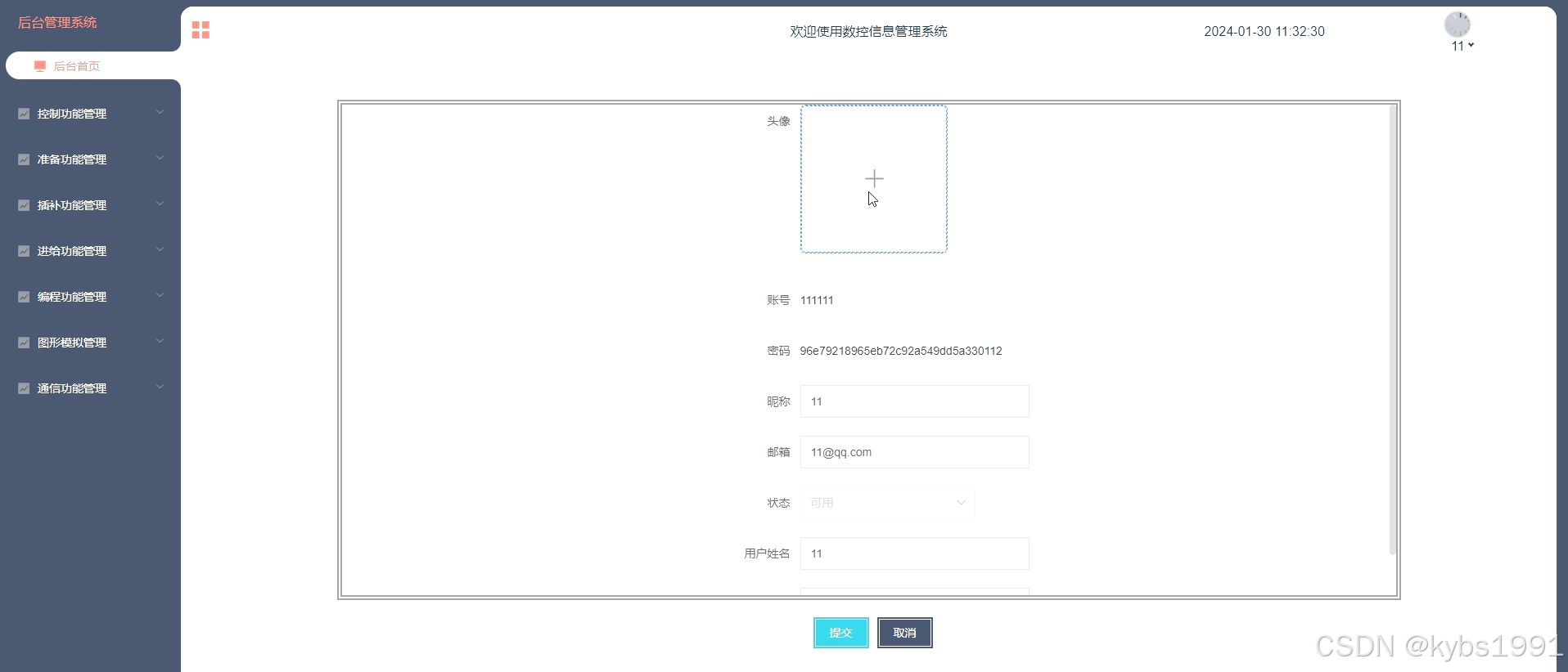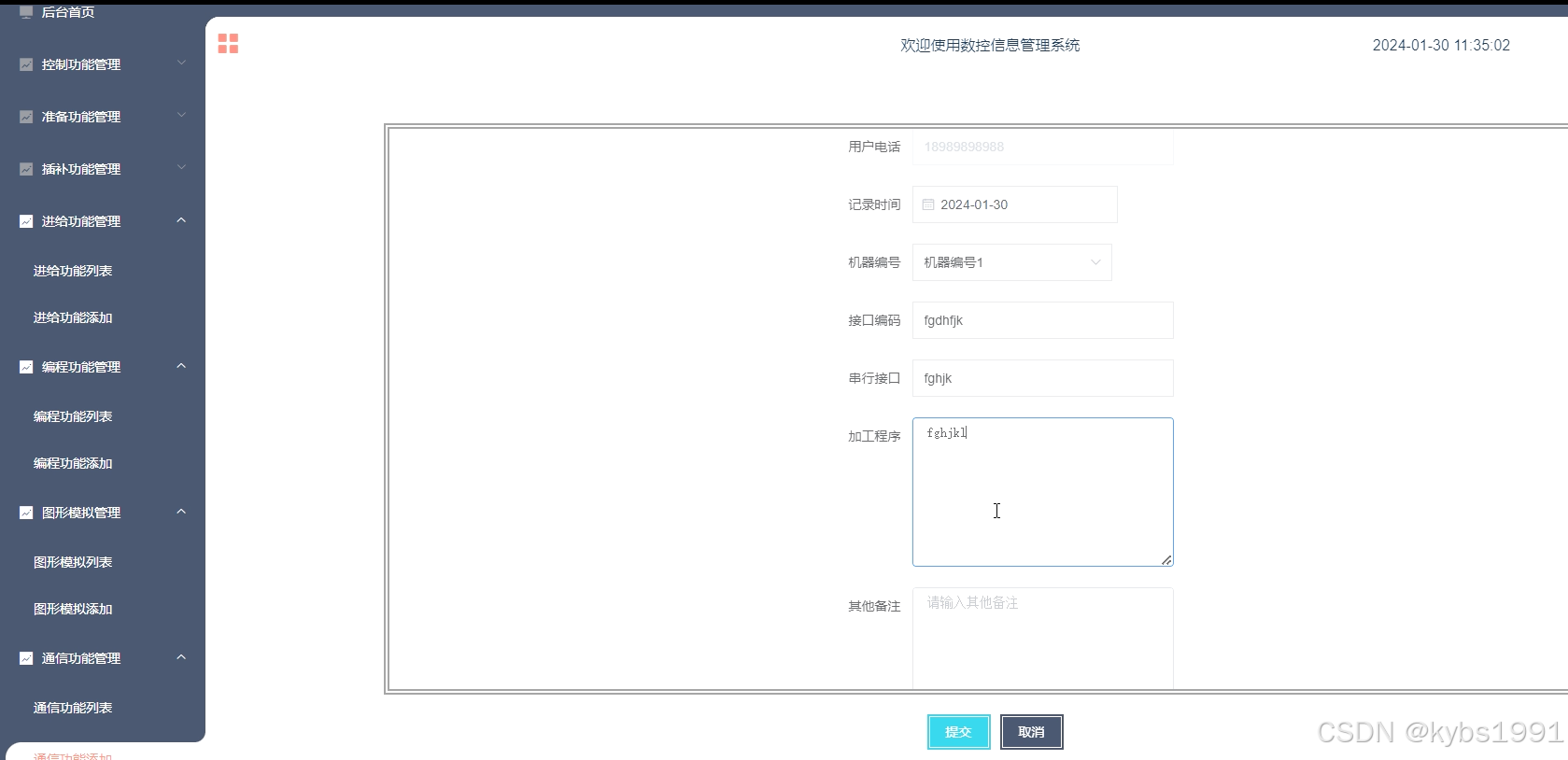(2)控制功能:用户进行控制功能信息的阅览,对控制功能信息进行添加,包含用户账号、用户姓名、用户电话、记录时间、机器编号、坐标轴数、其他备注等信息。