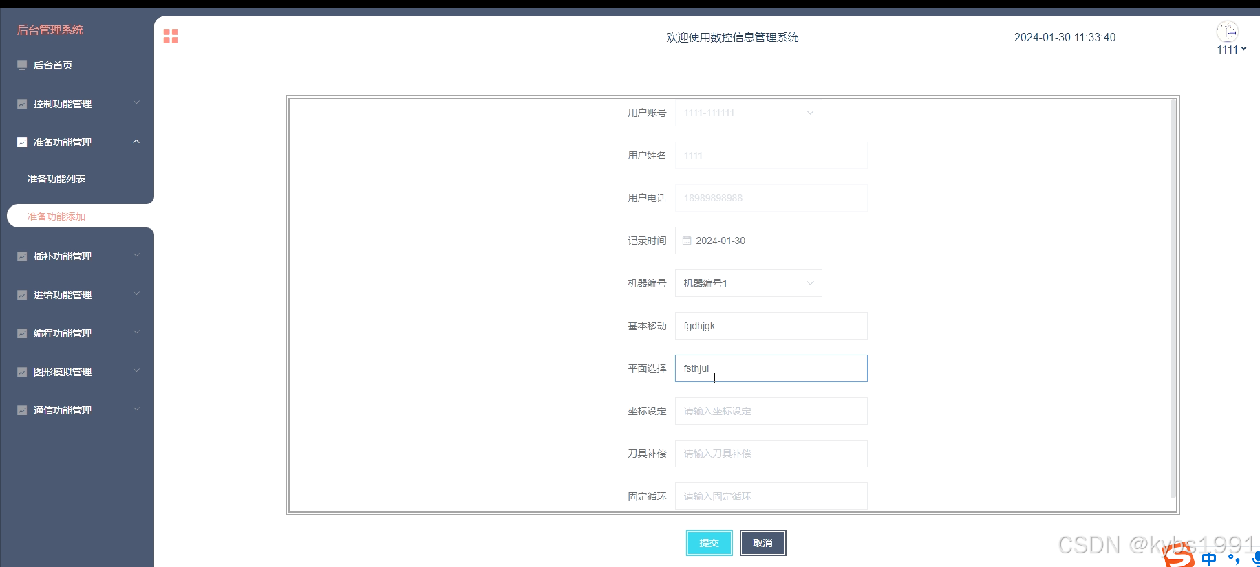 (3)准备功能管理:用户可以对准备功能信息进行添加,包含用户账号、用户姓名、用户电话、记录时间、机器编号、基本移动、平面选择、坐标设定、刀具补偿、固定循环等信息。