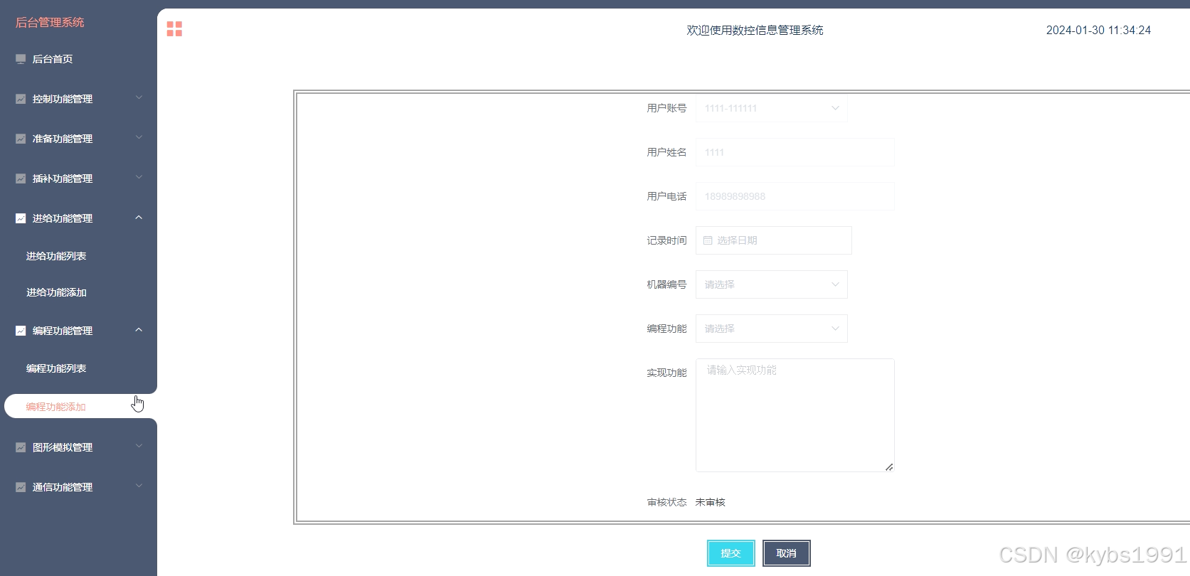 (6)编程功能管理:用户可以对编程功能信息进行增删改查。包含用户账号、用户姓名、用户电话、记录时间、机器编号、编程功能、实现功能、审核状态等信息。