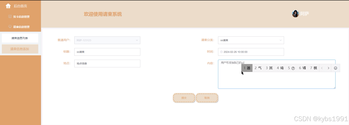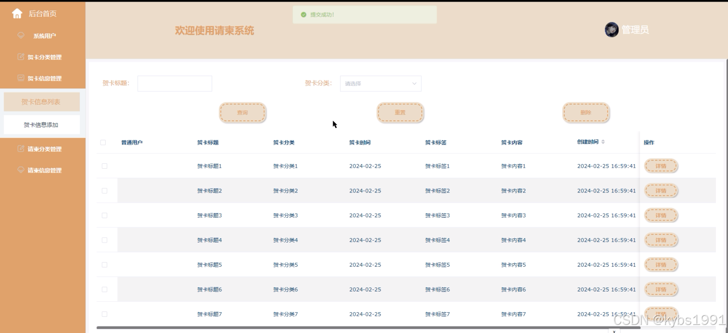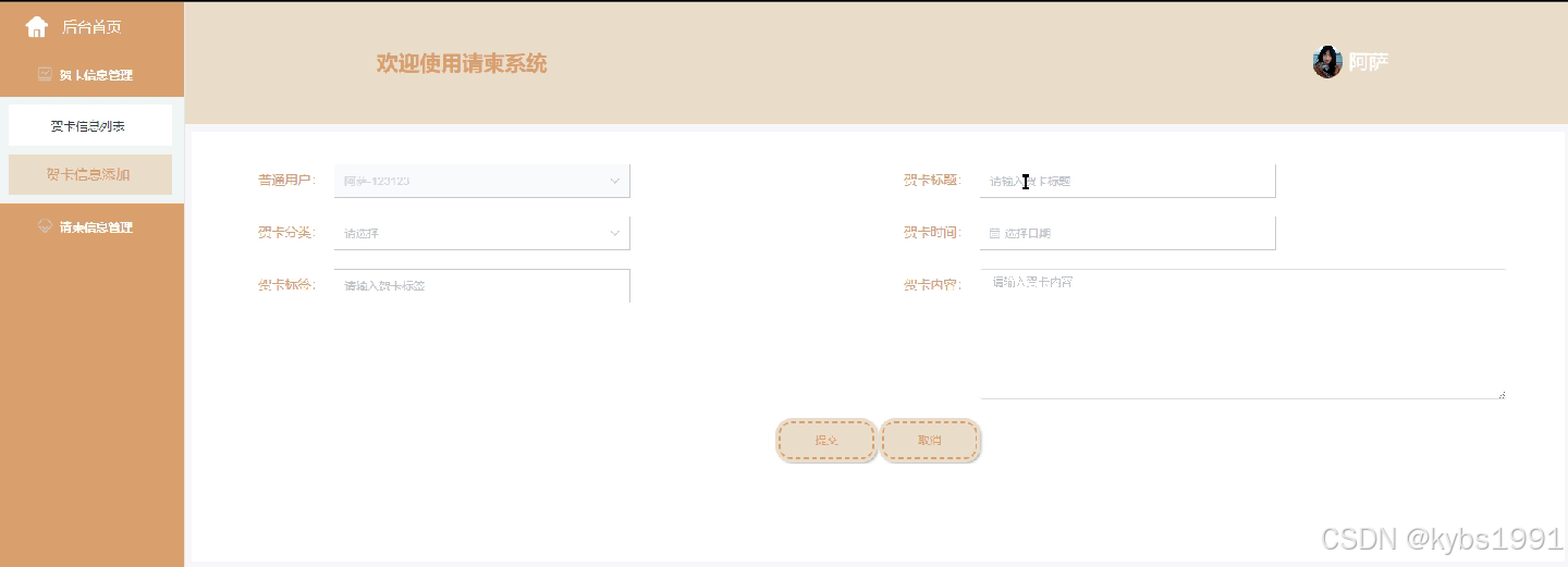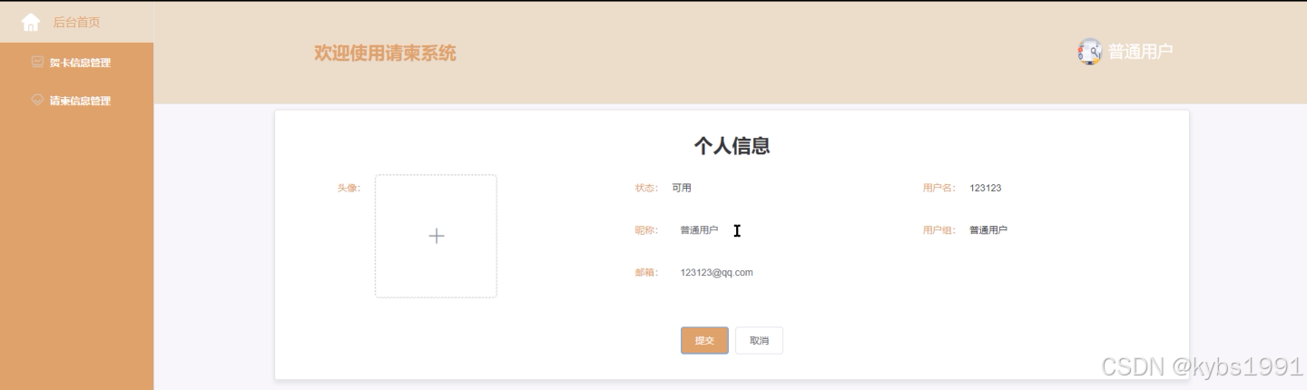 This invitation system has two roles: administrator and regular user. The administrator functions include backend homepage, system user management, greeting card classification management, greeting card information management, invitation information management, invitation classification management, etc. The user functions include greeting card information management, invitation information management, personal information, etc. Therefore, it has certain practicality.