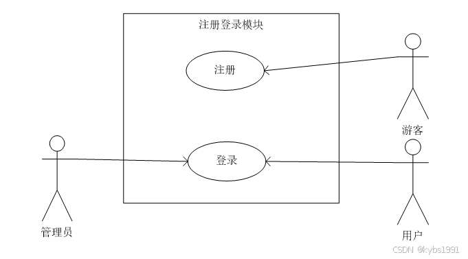 (1)注册登录模块:注册是游客独有的功能,注册后就成了系统的正式用户了,然后正式用户通过前台登录,管理员用户通过后台登录。注册登录模块用例如下图2-1所示。