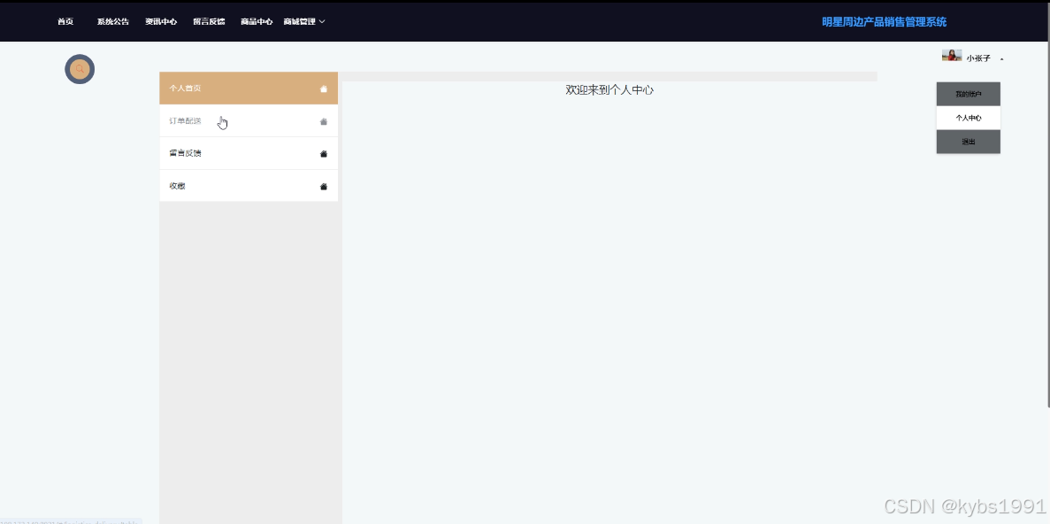当用户点击右上角“账号名”这个按钮,会出现子菜单,点击“个人中心”可以对个人首页、订单配送、留言反馈和自己收藏的信息进行设置管理。用户个人中心界面如下图4-11所示。