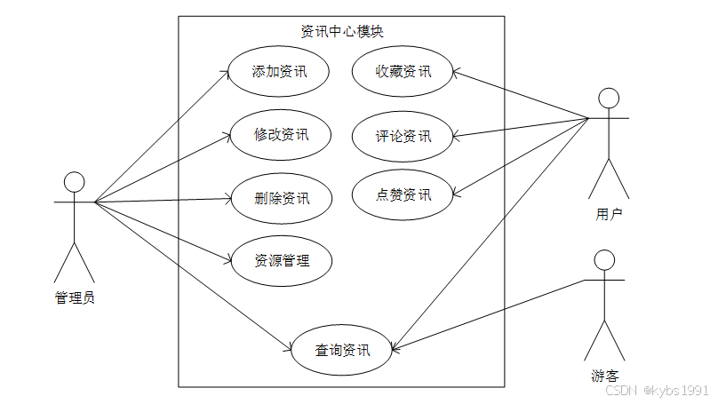 (3)资讯中心模块:游客可以查看资讯中心,用户可以收藏、评论、点赞资讯中心信息,管理员可以添加、修改、删除资讯中心,管理资讯评论。资讯中心模块用例如下图2-3所示。