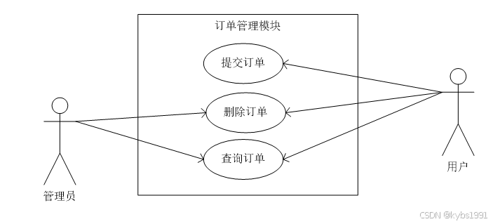 (7)订单管理模块:订单管理模块是前台用户和后台管理员都有的功能,前台用户可以提交订单,管理订单,管理员能够对用户订单进行管控。订单管理模块用例如下图2-7所示。