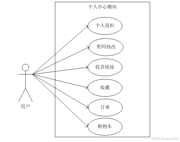 (8)个人中心模块:个人中心模块是用户独有的功能,可以管理个人资料,密码修改,我的收藏,我的购物车、我的订单、我的地址,用例如下图2-7所示。