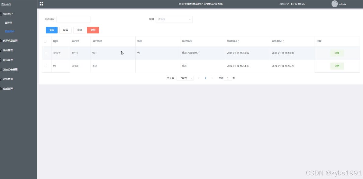 在后台系统用户管理中,主要是管理注册的普通用户和管理员用户,管理员拥有对所有用户管控的功能。系统用户界面如下图4-12所示。