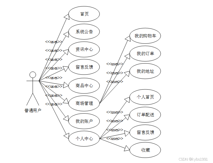 明星周边产品销售管理系统的完整UML用例图分别是图2-1和图2-2。在参与者上包括普通用户以及管理员。首页、系统公告、资讯中心、留言反馈、商品中心、商城管理(我的购物车、我的订单、我的地址)、我的账户、个人中心(个人首页、订单配送、留言反馈、收藏)等,普通用户角色用例如图2-1所示。