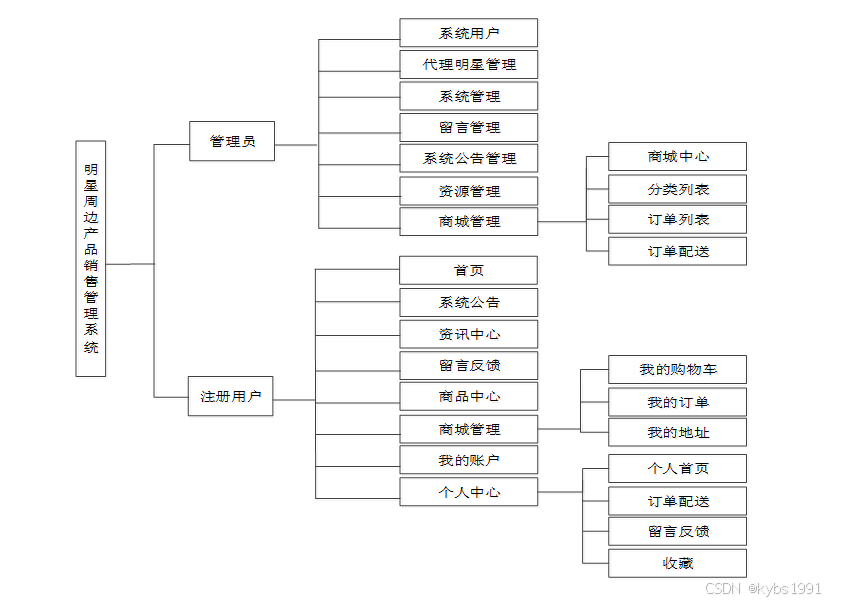 本SpringBoot明星周边产品销售管理系统的设计主要是针对三种用户进行使用,第一种是以游客身份使用,游客在进入系统后可以查看到系统中的所有内容,包括首页、系统公告、资讯中心、留言反馈、商品中心,如果想要留言评论或者购买,可以注册登录;第二种是注册之后有账号的用户,登录以后可以留言、收藏、评论、购买、管理收货地址、订单、个人资料等;第三种则是管理员,是系统的管理者,管理员对系统中的资讯中心、商品中心、用户提交的留言反馈、订单等信息进行整体把控。