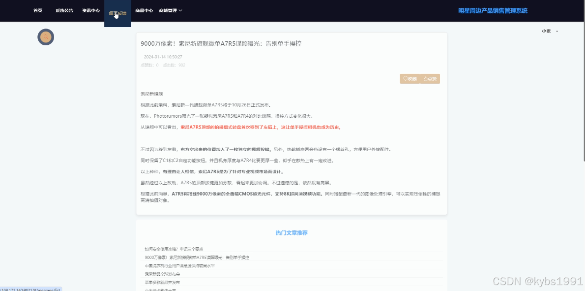当用户点击明星周边产品销售管理系统平台中导航栏上的“资讯中心”后将会进入到该“资讯中心”列表的界面,然后选择想要看的资讯信息,点击进入到详细界面,在详细界面可以收藏+赞+评论等操作。资讯中心详情界面如下图4-6所示。
