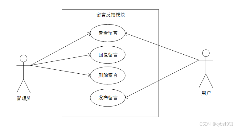 (2)留言反馈模块:留言反馈是前台用户进行留言内容提交,后台管理员对留言内容进行回复,增删改查。留言反馈模块用例如下图2-2所示。