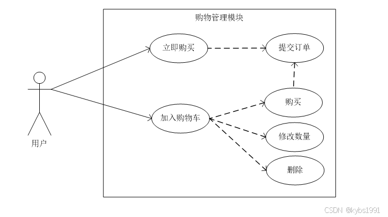 (6)购物管理模块:购物管理是前台用户独有功能,用户可以选择两种购买方式,一种是把商品加入到购物车,另一种是直接购买,最终实现购物功能,购物管理模块用例如下图2-6所示。
