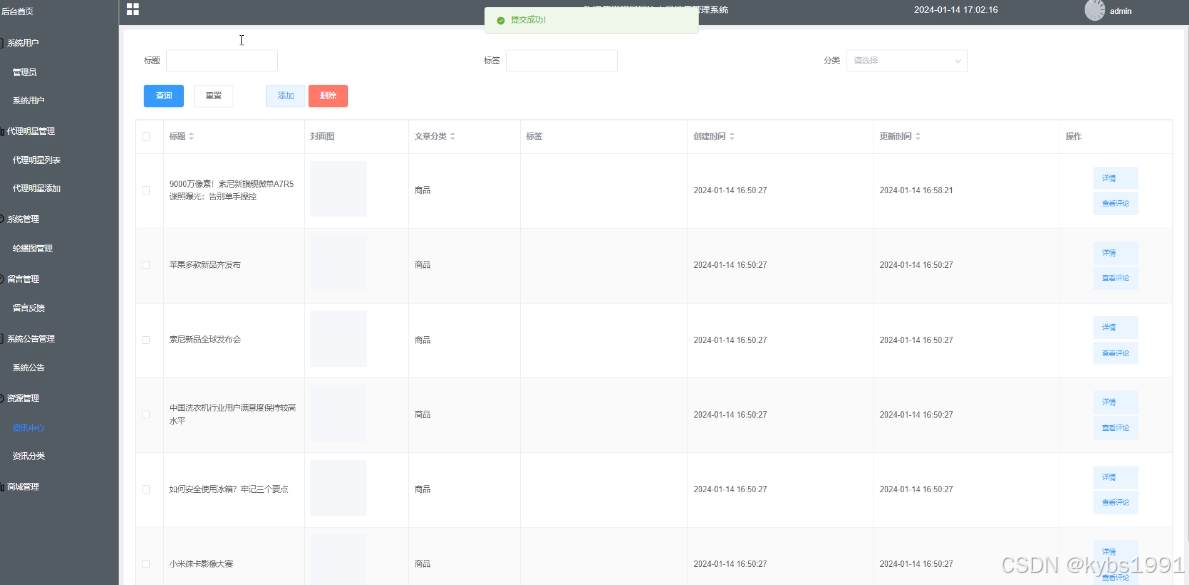 管理员拥有对前台资讯中心以及资讯分类管理的功能,资讯中心的界面如下图4-16所示。