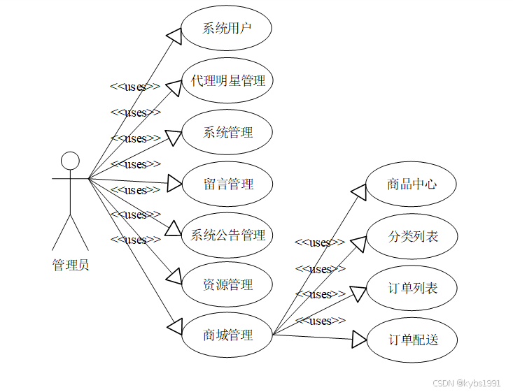 后台管理上的管理员是维护整个明星周边产品销售管理系统平台中所有数据信息的,管理员可以进行登录、系统用户、代理明星管理、系统管理、留言管理、系统公告管理、资源管理、商城管理(商品中心、分类列表、订单列表、订单配送)。管理员角色用例如图2-2所示。