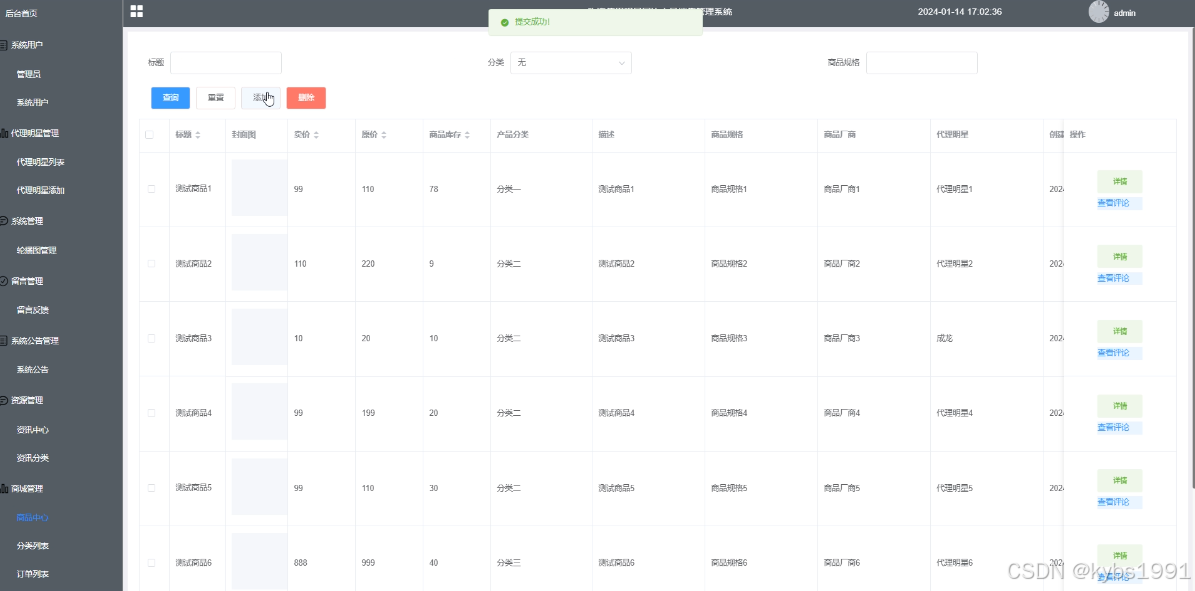 管理员拥有对商品中心中的商品进行添加、修改、删除、管理评论的功能,商品中心管理界面如下图4-17所示。