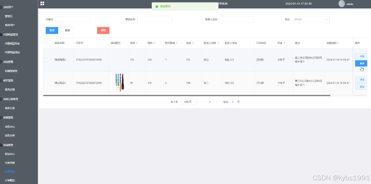 管理员拥有对所有订单的查询、删除的功能。可以对订单进行配送操作。订单列表界面如下图4-19所示。