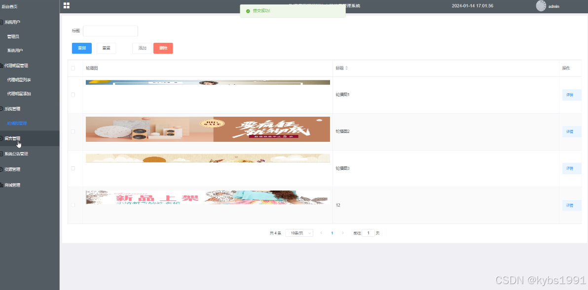 明星周边产品销售管理系统中的管理人员在“系统管理”这一菜单下是可以对明星周边产品销售管理系统内展示的轮播图进行添加修改的。系统管理界面如下图4-14所示。