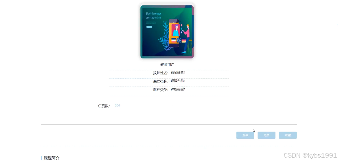 (5)课程信息:用户可以查看课程信息,支持通过搜索关键词的方式对课程信息进行查询,在查询到自己想要了解的课程信息的时候,可以进入查看详细的介绍,包括教师用户、教师姓名、课程名称、课程类型、课程简介。也可以对课程信息进行选课、点赞、收藏和发表评论。