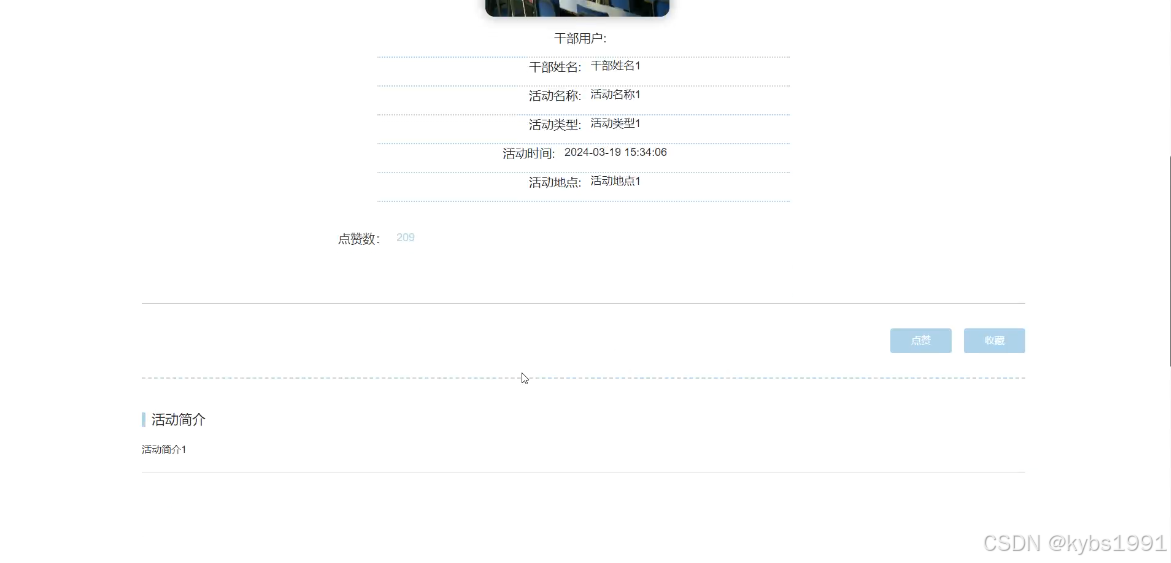 (6)班级活动:用户可以查看班级活动,支持通过搜索关键词的方式对班级活动进行查询,在查询到自己想要了解的班级活动的时候,可以进入查看详细的介绍,包括干部用户、干部姓名、活动名称、活动类型、活动时间、活动地点、活动简介。也可以对班级活动进行点赞、收藏和发表评论。
