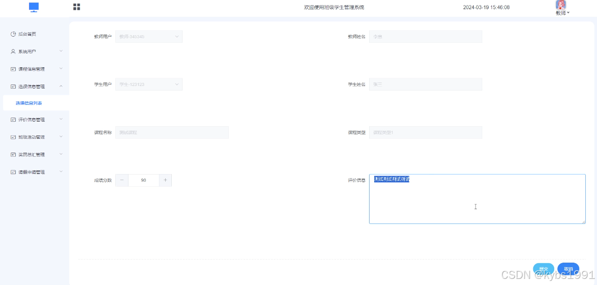 本文基于系统需求分析,设计了系统的整体架构和功能模块,其中包括班级信息管理、年级信息管理、课程信息管理、选课信息管理、评价信息管理、班级活动管理、奖罚类型管理、奖罚总汇管理、请假申请管理等模块。其次,通过Spring Boot快速搭建系统架构,利用框架提供的便捷特性完成系统的开发和部署。在系统实现过程中,充分考虑了系统的可扩展性和易用性,确保系统能够满足各种实际应用场景的需求。最后,通过系统功能测试和性能测试,验证系统的稳定性和性能表现,在真实环境中验证系统的可靠性和实用性。