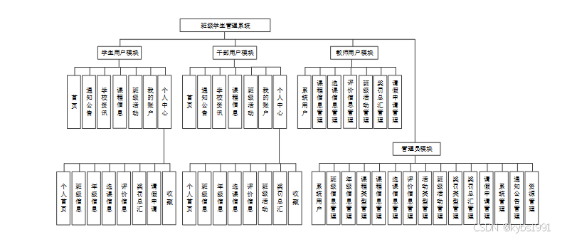 班级学生管理系统从角色上划分为了学生用户、干部用户、教师用户和管理员四种角色。本平台基于前台功能和后台管理员功能出发进行功能性需求分析。