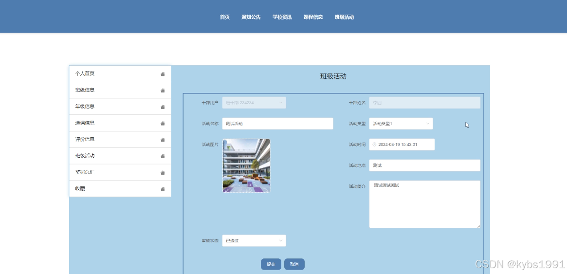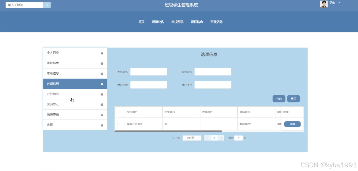 (8)个人中心:当前台用户点击右上角“个人中心”这个按钮,就会进入到对应的后台进行信息的管理了。学生用户在前台点击“个人中心”可以对个人首页、班级信息、年级信息、选课信息、评价信息、奖罚总汇、请假申请、收藏进行管理。干部用户在前台点击“个人中心”可以对个人首页、班级信息、年级信息、选课信息、评价信息、班级活动、奖罚总汇、收藏进行管理。