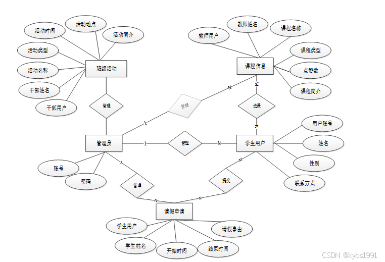 下面是整个班级学生管理系统中主要的数据库表总E-R实体关系图。