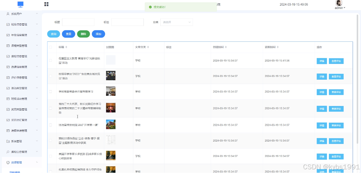 (16)资源管理:当管理员点击“资源管理”时,可查看学校资讯、资讯分类;如需添加新的学校资讯,点击左侧“添加”按钮,上传封面图,输入标题,选择分类,输入标签、描述和正文,点击“提交”按钮进行添加。