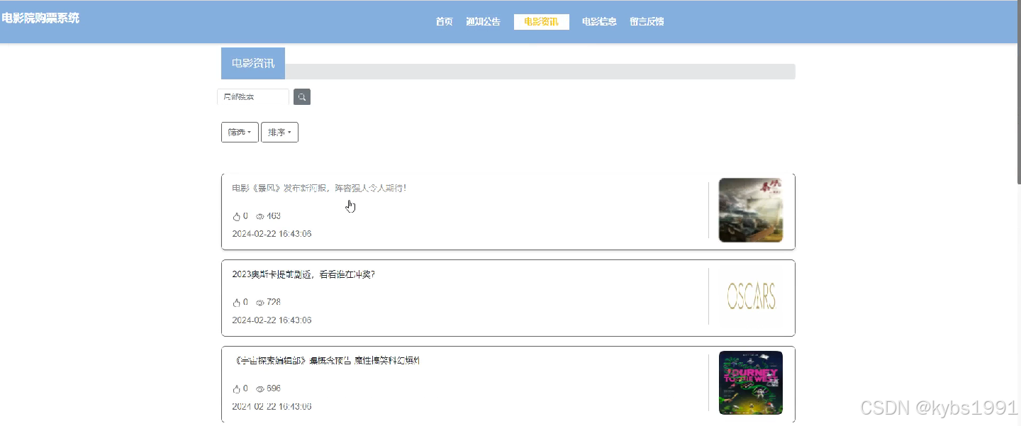 电影信息:展示平台上的电影信息列表,用户可以浏览电影信息,包括封面图、影院名称、电影名称、电影分类、电影时长、放映时间、电影票价、内容介绍等信息,可以搜索和筛选电影,可进行点赞、收藏或购票选座,界面如下图所示。