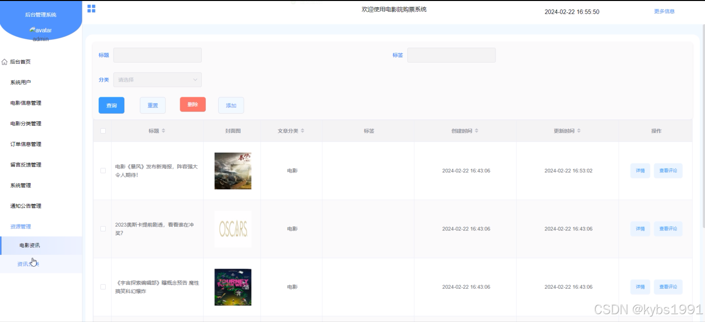 - 资源管理:管理员可以管理电影资讯,包括添加分类、编辑和删除资讯文章,更新资讯内容和排序。