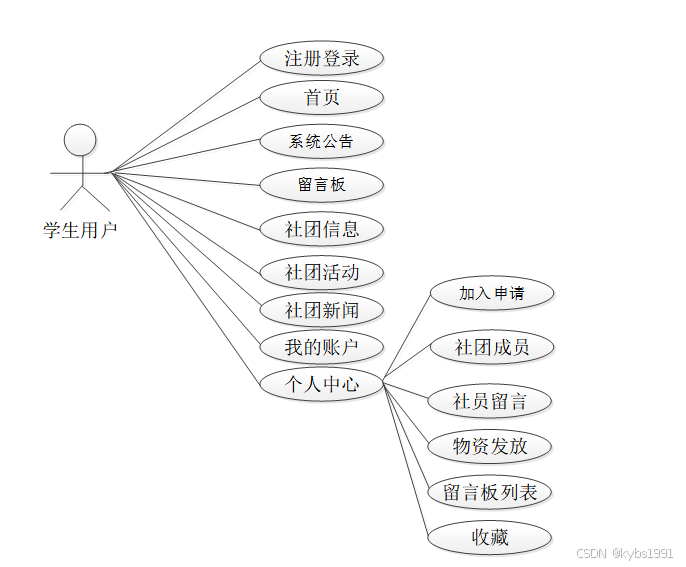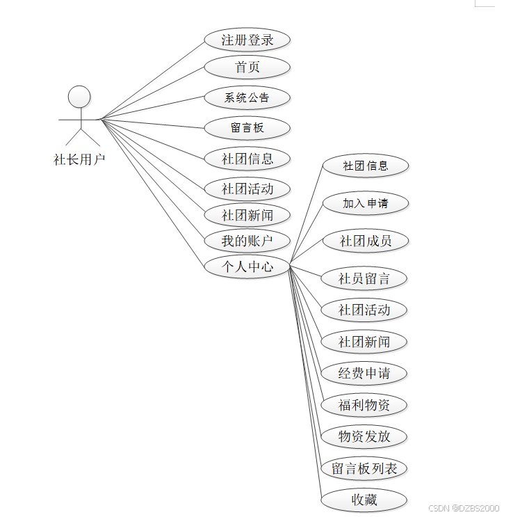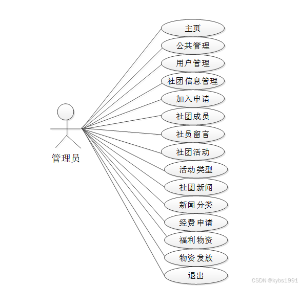 通过2.3功能的分析,得出了本大学生社团管理系统的用例图: