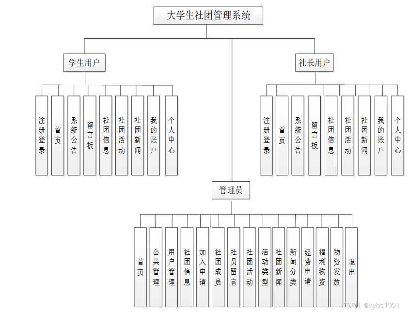 按照大学生社团管理系统的角色,主要包括学生用户模块、社长用户模块和管理员这三大功能模块,各模块功能内容如下: