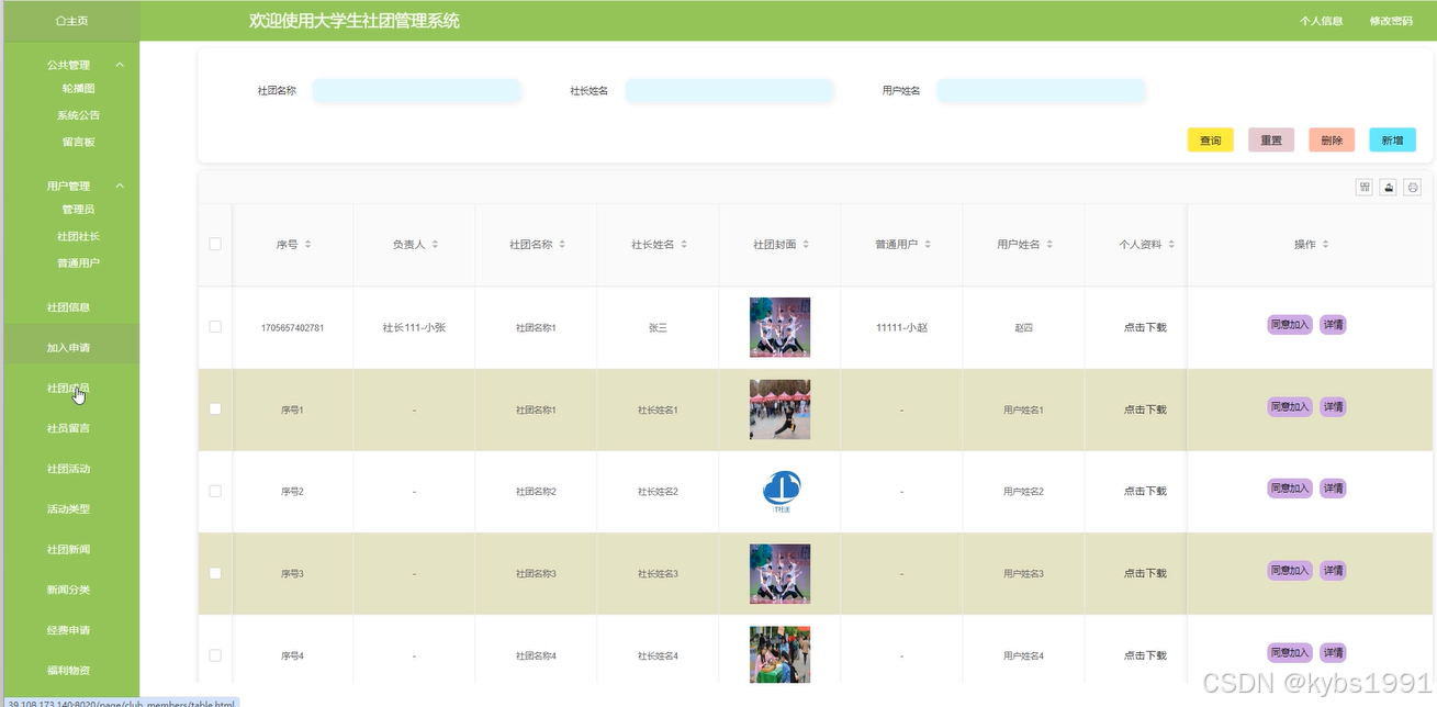 - 社团成员管理:管理员可以对社团成员信息进行增删改查操作。