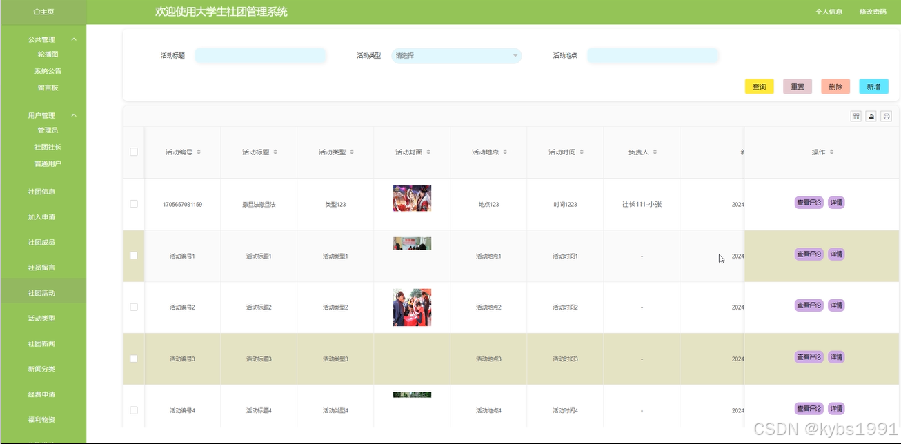 - 社团活动管理:管理员可以查看管理管理社团活动信息。
