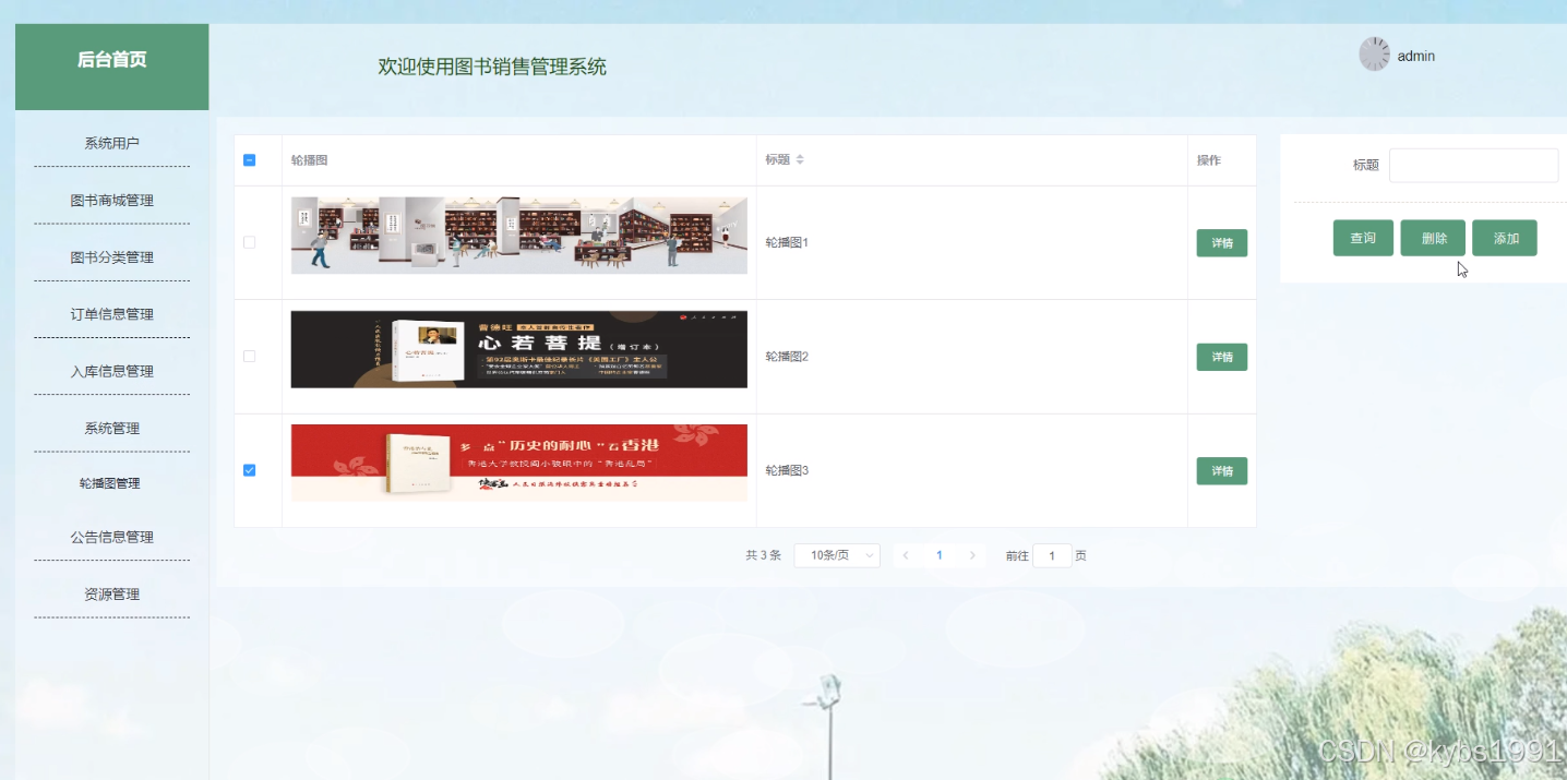 系统管理:轮播图管理: 允许管理员管理系统首页的轮播图,包括添加新轮播图、编辑轮播图信息、删除轮播图等操作。