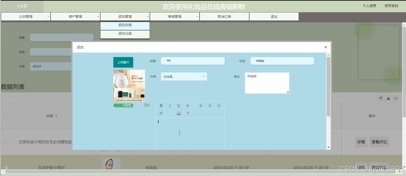 化妆品在线商城购物中的管理人员是可以对资源管理模块里的资讯列表、资讯分类两个子菜单进行物品发布的添加、维护和管理的,支持增删改查操作。界面如下图4-10所示。