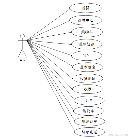 通过2.3功能的分析,得出了本化妆品在线商城购物的用例图: