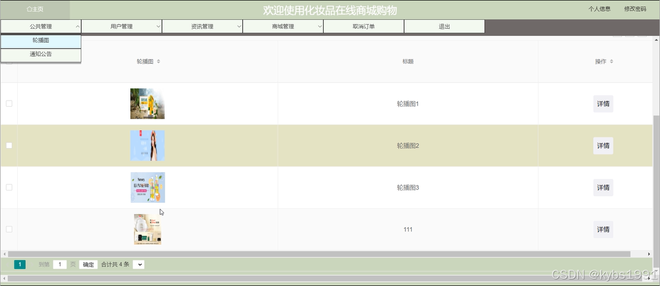 (2)公共管理:管理员可以对化妆品在线商城购物中首页显示的轮播图以及系统中的一些公告发布到系统当中,让用户及时的查看到系统信息,进行合理安排。