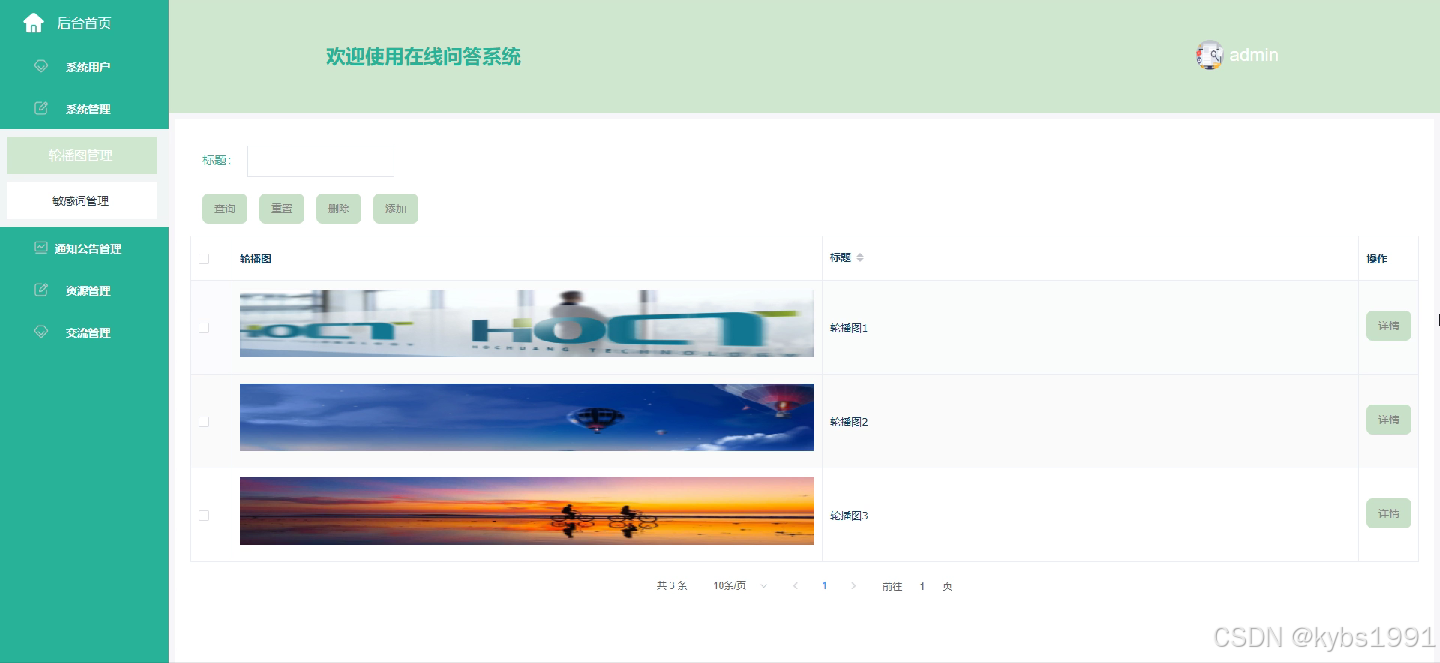 (2)系统管理:当点击“系统管理”这一菜单的时候,会出现轮播图+敏感词管理这两个个子菜单,可以对这两个模块进行增删改查操作;