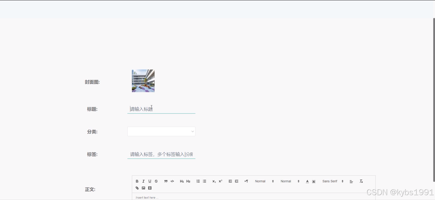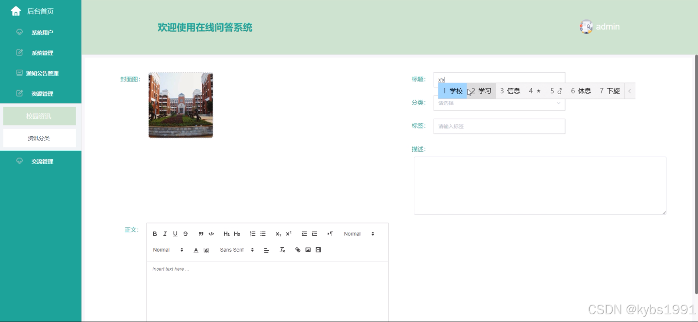 在线问答系统中的管理人员在“资源管理”这一菜单下是可以对在线问答系统内的校园资讯以及资讯所属的分类列表进行管控,包含了用户对校园资讯提交的评论信息,以校园资讯为例,添加校园资讯界面如下图4.12所示。