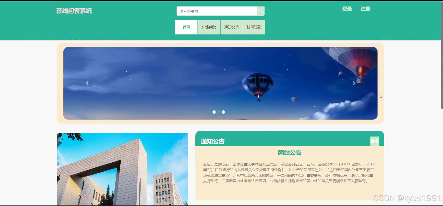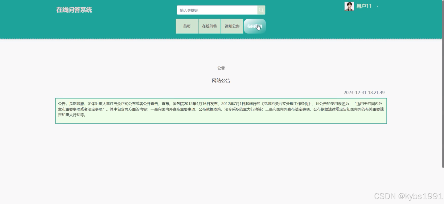 (2)通知公告:在首页导航栏上我们会看到“通知公告”这一菜单,我们点击进入进去以后,会看到所有管理员在后台发布的公告信息;