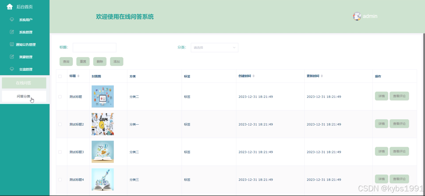 (6)交流管理:当点击“交流管理”这一菜单的时候,管理员可对在线问答详情进行查看评论、添加分类、删除等操作;