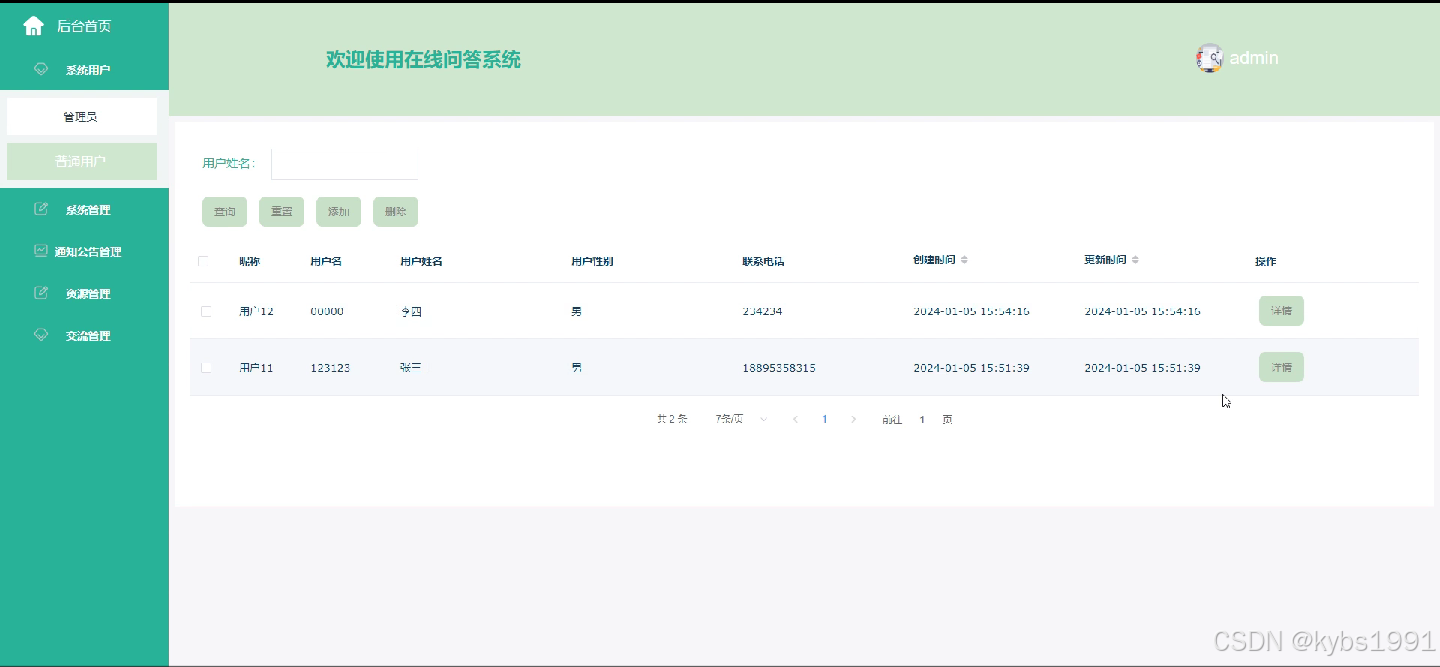 (3)系统用户管理:当点击“系统用户管理”这一菜单的时候,会出现管理员+普通用户两个子菜单,可以对这两个模块进行增删改查操作;