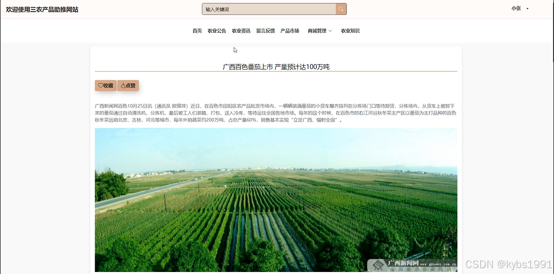 当普通用户点击“农业资讯”后,用户可以查看资讯详情,并可进行点赞、收藏、评论等操作,界面如下图4-6所示。