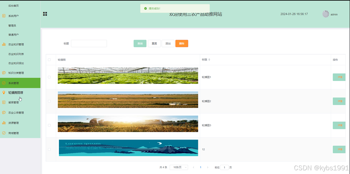 管理员点击“系统管理”这一菜单会显示轮播图这一个子菜单,管理员可以对前台展示的轮播图进行设置,界面如下图4-11所示。