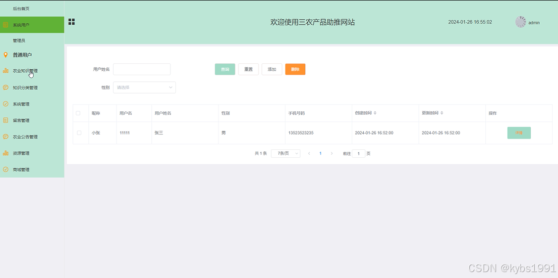 基于SSM的三农产品助推网站中的管理人员是可以对注册的普通用户进行管理的,也可以对管理员进行管控。界面如下图4-10所示。